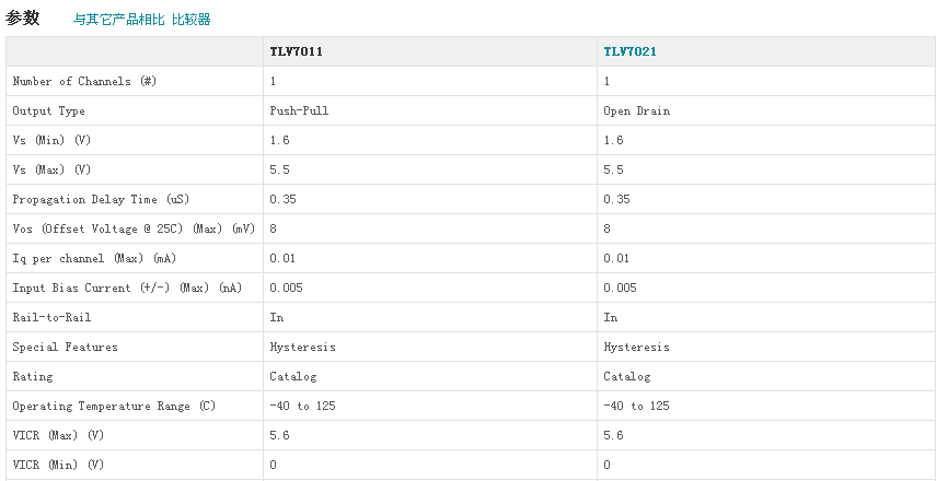 The TLV7011 and TLV7021 offer an excellent speed-to-power combination with a propagation delay of 300 ns and a quiescent supply current of 5 µA. This combination of fast response time at micropower enables power conscious systems to monitor and respond quickly to fault conditions. With an operating voltage range of 1.6 V to 5.5 V, these comparators are compatible with 3-V and 5-V systems.