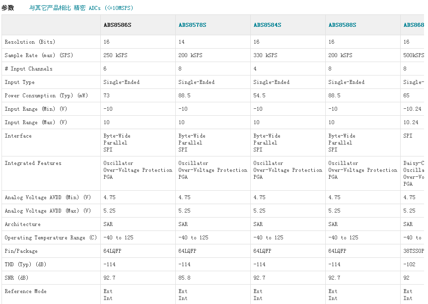 ADS8586S 器件是一款基于集成式数据采集 (DAQ) 系统的 6 通道、16 位、逐次逼近型 (SAR) 同步采样模数转换器 (ADC),每通道的最大采样频率为 250kSPS。该器件 每个 通道都有一个完整的模拟前端,其中包含输入阻抗高达 1MΩ 的可编程增益放大器 (PGA)、输入钳位、低通滤波器和 ADC 输入驱动器。此外,该器件还 具备 带缓冲器的低漂移、高精度基准电压,以用于驱动 ADC。凭借灵活的数字接口,该器件支持串行、并行和并行字节通信,适用于各种主机控制器。的前两个句子