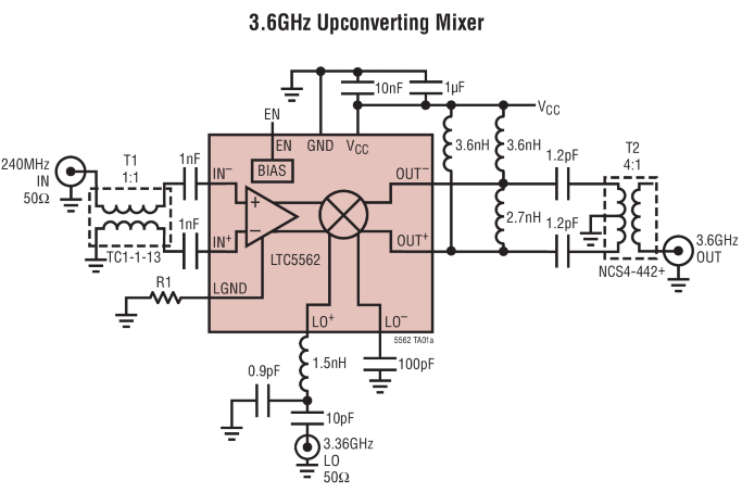 LTC®5562 是一款通用型低功率混频器,专为要求宽输入带宽、低失真和低 LO 泄漏的应用而优化。该混频器可用于上变频或下变频应用,并提供一个 1dB 的标称转换增益。差分输入专为使用 1:1 传输线平衡-不平衡变压器而优化,输入在 30MHz 至 7GHz 范围内为 50Ω 宽带匹配。