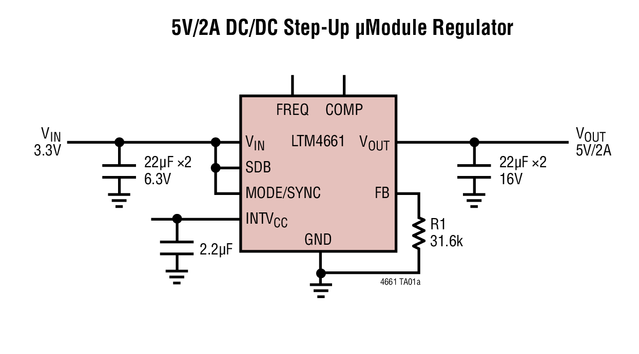 LTM®4661 是一款同步升压型开关模式μModule® (电源模块) 稳压器,其采用 6.25mm x 6.25mm x 2.42mm BGA 封装。封装中内置了开关控制器、功率 FET、电感器和所有的支
