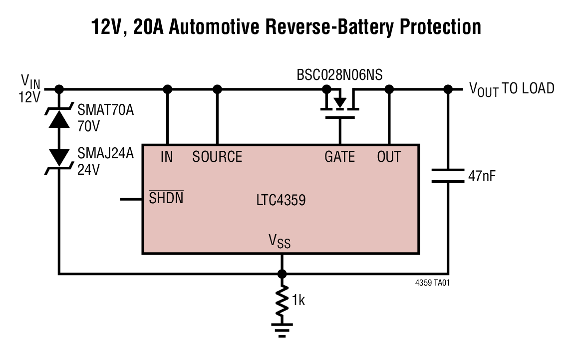 当在高电流二极管应用中使用时,LTC4359 可减低功耗、热耗散、电压损耗和 PC 板占用面积。凭借其宽工作电压范围、反向输入电压承受能力和高额定温度,LTC4359 可满足汽车和电信应用的苛刻要求。另外,LTC4359 还能容易地在具有冗余电源的系统中对电源进行 “或” 操作。