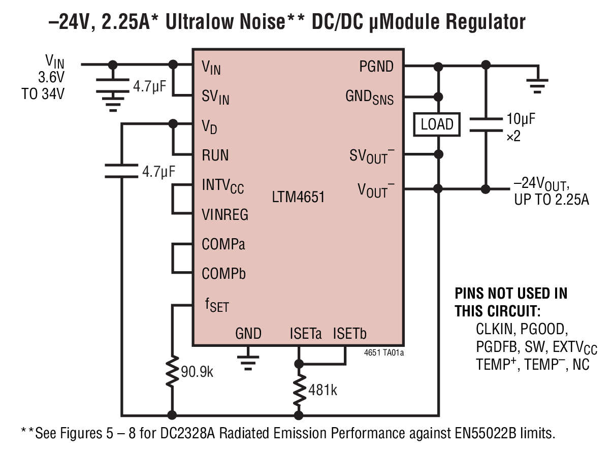 LTM®4651 是一款超低噪声、58V、24W DC/DC μModule® 负输出拓扑稳压器。它从一个正输入电源电压 (VIN) 调节一个负输出电压 (VOUT–),并且专为满足 EN55022 规格的辐射发射要求而设计。传导发射要求可通过增设标准的滤波器组件来满足。封装中内置了开关控制器、功率 MOSFET、电感器、滤波器和支持组件。LTM4651 能够把 VOUT– 调节一个介于 –0.5V 和 –26.5V 之间的数值,前提是其输入和输出电压遵从 LTM4651 的安全工作区准则:VIN +|VOUT–|≤ 58V。LTM4651 支持一个 250kHz 至 3MHz 的开关频率范围 (默认值为 400kHz),而且该模块可同步至一个外部时钟。尽管该器件是一款负输出拓扑稳压器,但是连接至 LTM4651 的 RUN、PGOOD 或CLKIN 引脚并不需要电平移位电路;这些引脚参考于 GND。LTM4651 可提供 15mm x 9mm x 5.01mm BGA 封装,采用 SnPb 或符合 RoHS 标准的端子涂层。