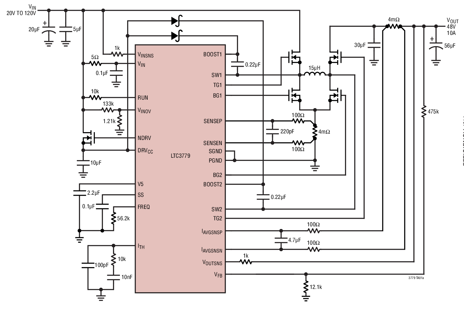 LTC®3779 是一款高性能降压-升压型开关稳压控制器,其可在输入电压高于、低于或等于输出电压的情况下工作。该器件运用了恒定频率电流模式架构,故可提供一个高达 600kHz 的可锁相频率,而一个输入 / 输出恒定电流环路则提供了对电池充电的支持。凭借 4.5V 至 150V 的宽输入和输出范围以及工作区之间的无缝转换,LTC3779 成为了汽车、电信和电池供电型系统的理想选择。LTC3779 具有一个精准的 1.2V 基准和电源良好输出指示器。MODE 引脚能够选择执行脉冲跳跃模式或强制连续操作模式。脉冲跳跃模式在轻负载条件下可实现最高的效率,而强制连续模式则工作于一个恒定的频率以满足噪声敏感型应用的需要。PLLIN 引脚允许将 IC 同步至一个外部时钟。SS 引脚在启动期间使输出电压斜坡上升。电流折返功能电路可限制短路情况下的 MOSFET 热耗散。