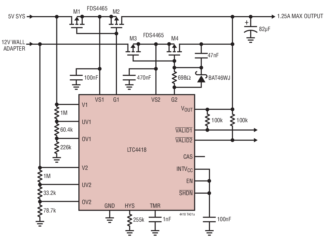 LTC®4418 可根据优先级和有效性把两个有效电源之一连接至一个公共输出。优先级由引脚分配来确定,V1 被分配了较高的优先级,而 V2 则为较低的优先级。当某个电源的电压连续处于其过压 (OV) 和欠压 (UV) 窗口之内的时间至少为配置的验证时间时,该电源就被定义为“有效”。假如优先级最高的有效输入脱离了 OV/UV 窗口,则立即将该通道断接,并把另一个有效输入连接至公共输出。可将多个 LTC4418 以及三通道器件 LTC4417 级联起来,以在多于 2 个输入之间提供切换。