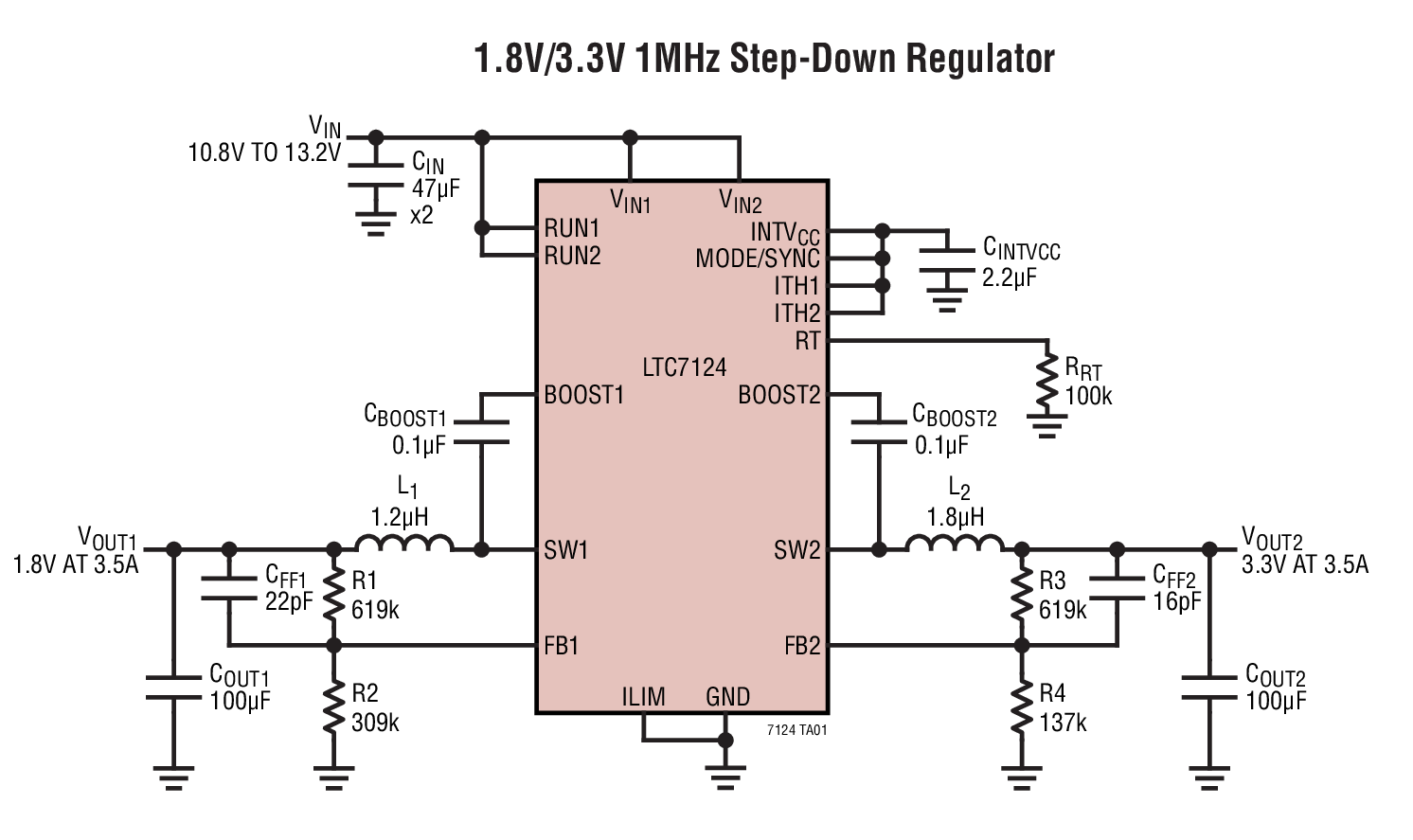 LTC®7124 是一款双通道、每路输出 3.5A 的高效率单片式降压型稳压器,该器件能够采用高达 17V 的输入电源工作。可编程开关频率范围从 500kHz 至 4MHz,并具有一个围绕编程频率的 ±25% 外部时钟同步能力。稳压器具有超低的静态电流,可在宽 VOUT 范围内实现高效率。该降压型稳压器在 3.1V 至 17V 的输入电压范围内工作,并可在输送高达每通道 3.5A 输出电流的同时提供一个介于 0.6V 和 99% VIN 之间的可调输出范围。该器件提供了一个用户可选模式输入,以允许用户通过牺牲输出纹波指标来换取轻负载效率的提升;突发模式 (Burst Mode®) 操作可在轻负载条件下提供最高的效率,而强制连续模式则可提供最低的输出纹波。LTC7124 内置了扩展频谱调制功能电路以实现低的辐射和传导噪声。LTC7124 采用耐热性能增强的扁平 24 引脚 3mm x 5mm QFN 封装。