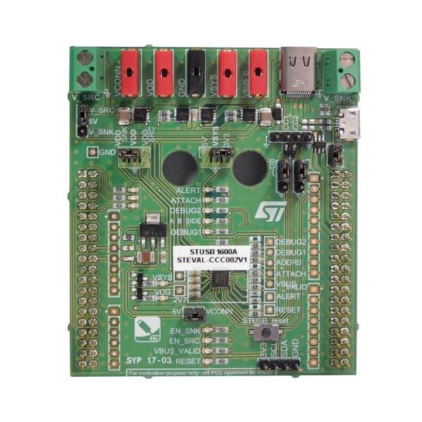 STMicroelectronics STEVAL-CCC002V1评估板可用于为全功能5V USB Type-C端口和STUSB1600A Type-C控制器创建原型。该端口可配置为源端、接收端或双电源角色。根据端口电源角色配置和所连接的器件,源端和接收端VBUS电源路径可由STUSB1600A直接启用。