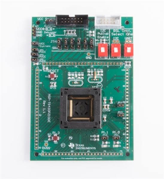 Texas Instruments MSP-TS430PZ100E Target Development Board is a standalone 80-pin ZIF socket target board. The board is used to program and debug the MSP430 MCU in-system through the JTAG interface or the Spy Bi-Wire (2-wire JTAG) protocol. The MSP-TS430PZ100D development board supports MSP430FR604x FRAM MCUs in a 80-pin LQFP package.