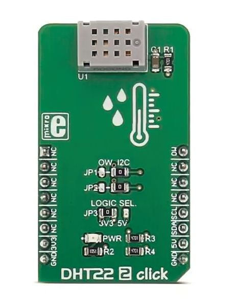 MikroElektronika MIKROE-2818 DHT22 2 Click板用于测量环境温度和相对湿度。DHT22 2 Click板采用CM2322传感器,具有非常准确的热量和湿度测量功能。该 MIKROE-2818 DHT22 2 Click板采用1-Wire或I2C协议与集成电路进行通信。DHT22 2 Click传感器具有超小尺寸,低功耗,数据信号传输距离达20米,测量精度高。该 MIKROE-2818 DHT22 2 Click板传感器非常适合用于需要测量温度和湿度的应用。