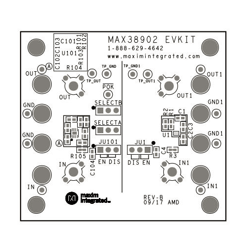 TDFN电路用于评估MAX38902A/B,而晶圆级封装 (WLP) 电路用于评估MAX38902C/D。该套件的每个电路均可提供高达500mA的输出电流。该套件预装有MAX38902A-ATA+和MAX38902C-ANT+。