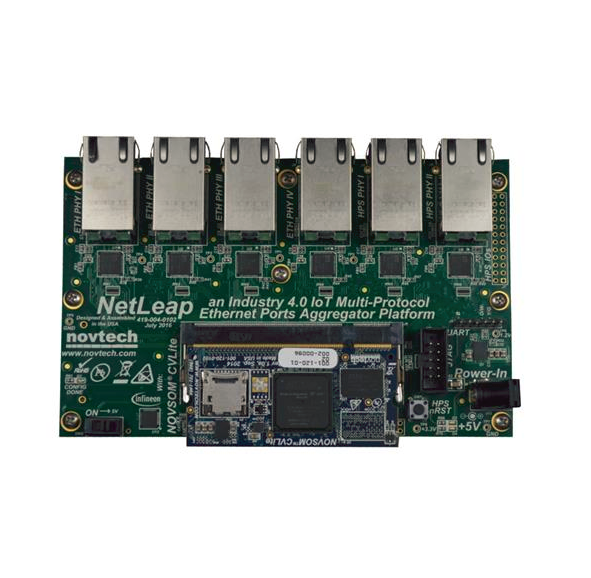 NovTech NetLeap™ 4.0 Multi-Protocol Ethernet Ports Aggregator Platform is based on the Cyclone V SoC-based NOVSOM CVL, and comes with the largest FPGA in this family, the 110K LE. This kit allows for the development and integration of many Ethernet protocols including PROFINET®, EtherCAT®, EtherNet/IP, Ethernet Powerlink, Modbus TCP, and SERCOS III.