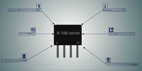 RECOM Power R-78S 0.1A SIP4 Single Output DC/DC Converters feature an input voltage range of 0.65V to 3.3V and can run from a single-cell battery. The voltage range of the R-78S means that alkaline, NiCd, NiMH, zinc-carbon, or lithium chemistry cells can be used to generate a stable 1.8V, 3.3V or 3.6V output. This output can power microprocessors, WLAN/Bluetooth® modules, and low power Internet of Things (IoT) systems. R-78S also provides high efficiency (93%) and low standby consumption (7µA input current in standby), extending battery lifetimes.