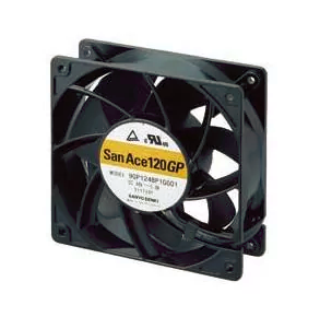 The San Ace 120GP 9GP Type Fans feature a rated input of 38.4W, a sound pressure level of 62dB, and measure 120mm x 120mm x 38mm. The San Ace 172GP 9GP Type G Proof Fans feature a rated input range of 120W to 240W, a sound pressure level range of 77dB to 83dB, and measure ø172mm x 150mm x 51mm. Both series of fans are black coated aluminum with a UL94V-1 rated plastic impeller. The Sanyo Denki G-Force fans have a dielectric strength of 50/60Hz at 500VAC for 1 minute between the lead conductor and frame. The motor protection system offers a current blocking function and reverse polarity protection.