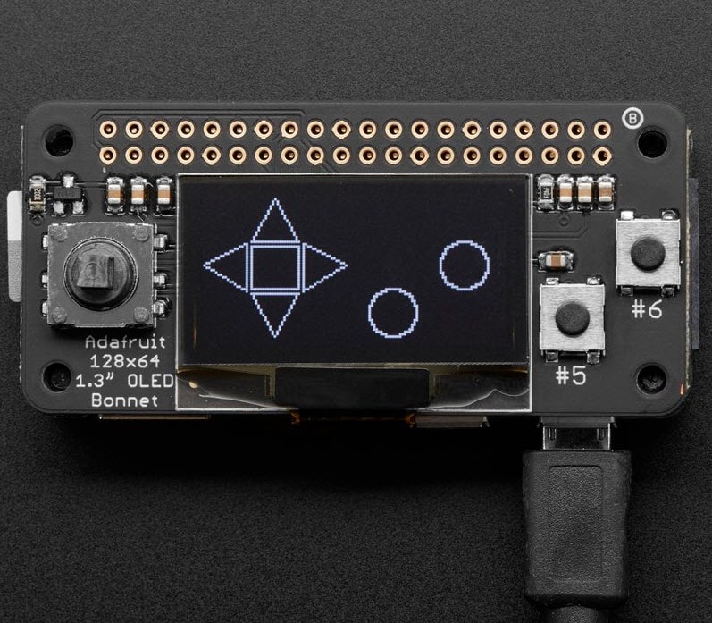 Adafruit 128x64 OLED Bonnet for Raspberry Pi with individual white OLED pixels with a 5-way joystick and two pushbuttons