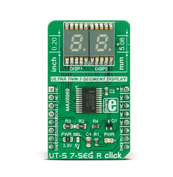 UT-S 7 SEG R click板由MAX6969驱动,使用两个SMD超薄DSM7UA20101 7-SEG LED显示屏,均采用专利技术制造,厚度仅2.1mm。MAX6969使用SPI串行接口进行通信,为LED段提供稳定的恒定电源。