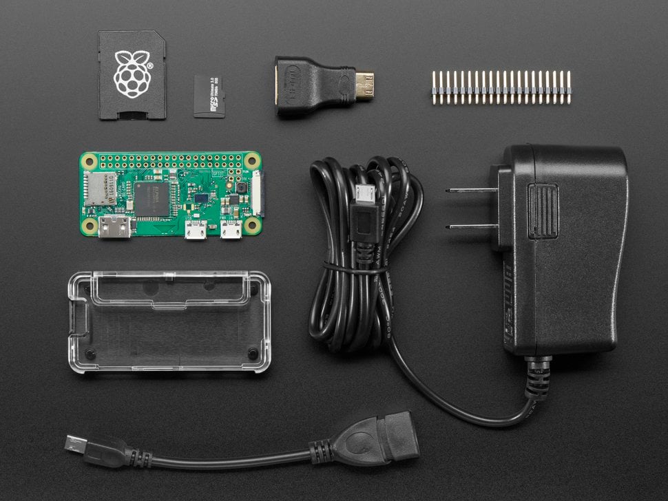 Adafruit Raspberry Pi Zero W Budget Pack includes everything needed to get going with the Wi-Fi-enabled Pi Zero W. The pack includes a Raspberry Pi Zero W, a mini HDMI to HDMI adapter, USB OTG cable, 8GB SD card, Pi Zero enclosure, 5V 1A or 5V 2A power supply, USB A/micro B cable and a 2x20 male header strip.