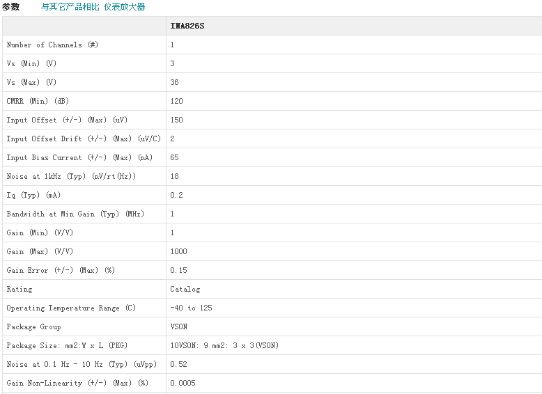 3mm VSON 表面贴装式封装。INA826S 的额定工作温度范围为 –40°C 至 +125°C。
